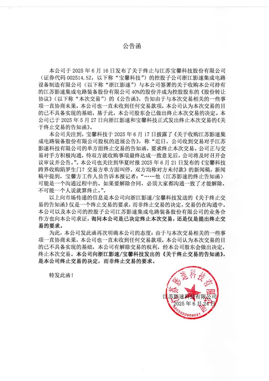 控股股东必一·运动(B-Sports)科技已终止与宝馨科技(证券代码002514.SZ)的控股子公司浙江必一·运动(B-Sports)关于收购本公司40%股份的交易